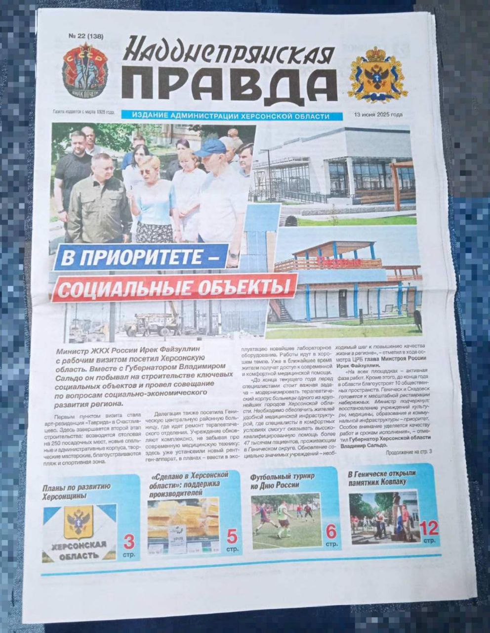 Проте у черговому номері тієї ж «Надднепрянской правды» інформації про події якраз і не знайти. Лише суцільні обіцянки того, що буде у майбутньому. «Вже найближчим часом жителі отримають доступ до сучасної і комфортної медичної допомоги», – цитують пропагандисти на першій шпальті міністра ЖКГ РФ Ірєка Файзулліна, який недавно приїжджав у Генічеськ подивитись, як «ремонтується» відремонтована перед самою окупацією тамтешня лікарня. «Генічеськ і Скадовськ готуються до масштабної реконструкції набережних», – розповідає про плани, які навіть не починають здійснюватись, «губернатор» Володимир Сальдо.