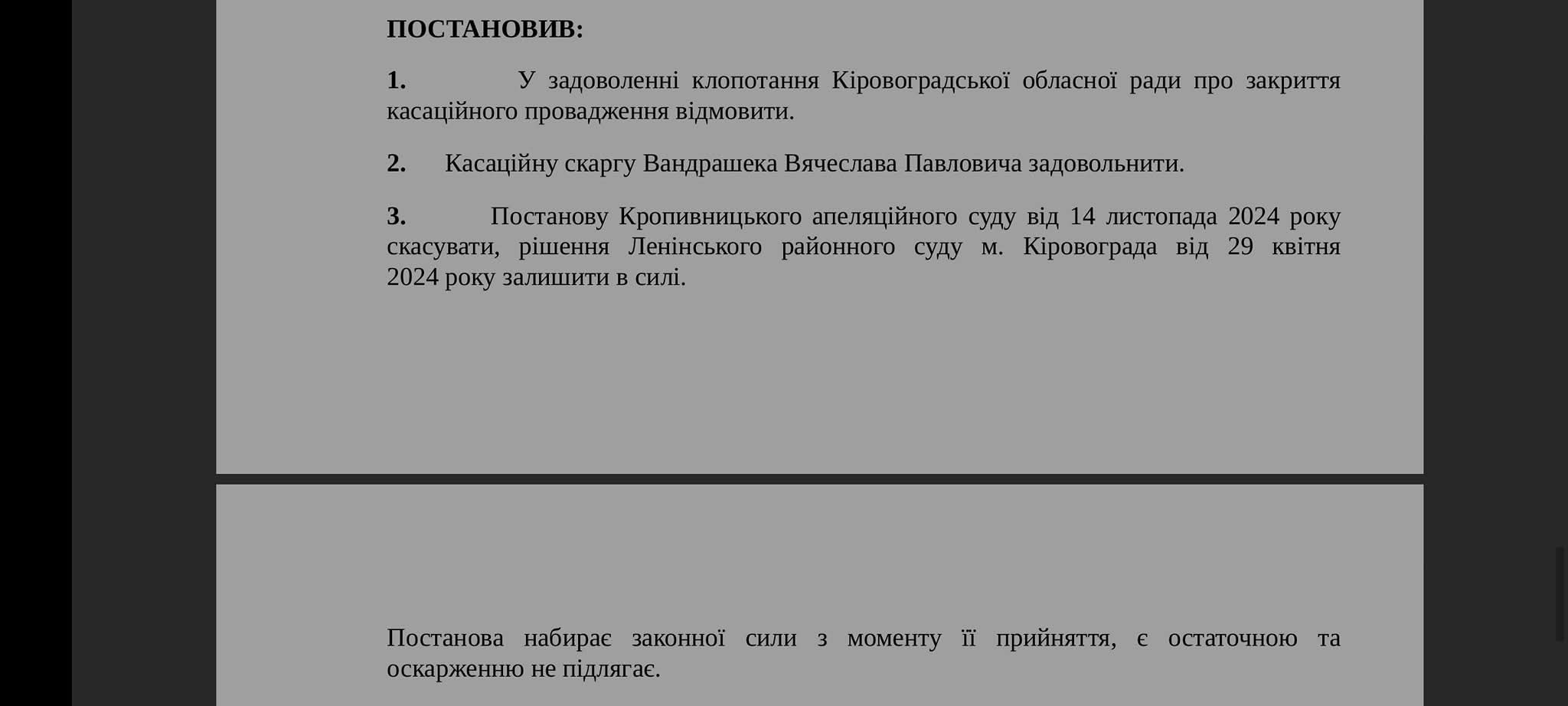 Постанова Верховного суду України від 2 липня 2025 року підтверджує законне рішення Подільського суду м. Кропивницький про скасування розпорядження голови обласної ради щодо незаконного звільнення Вандрашека і зобов’язує поновити його на посаді директора – художнього керівника театру ім. Кропивницького. Рішення є негайним до виконання і оскарженню не підлягає.