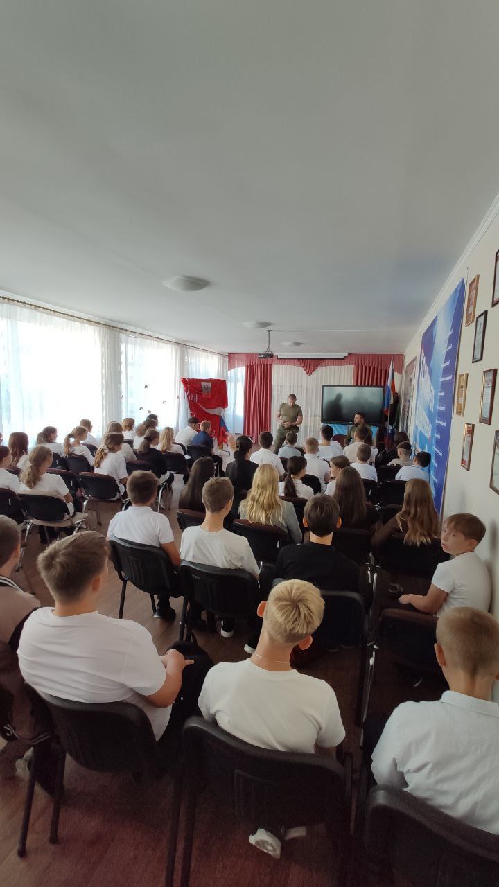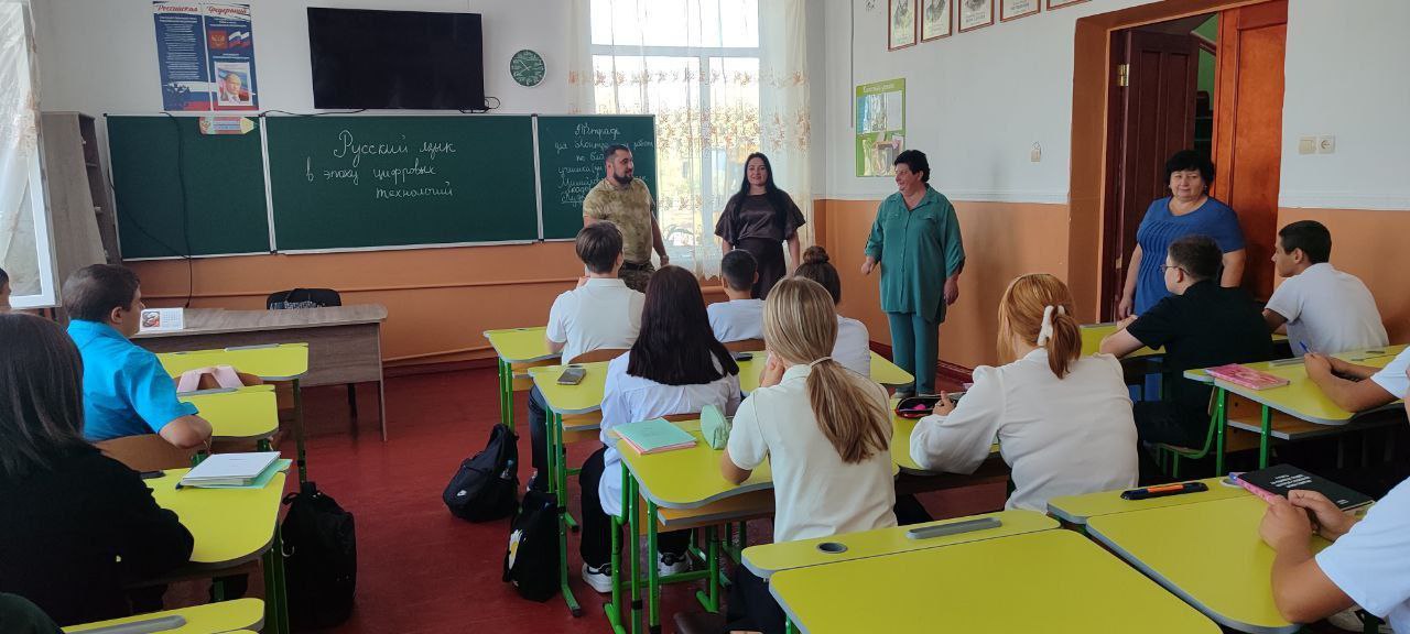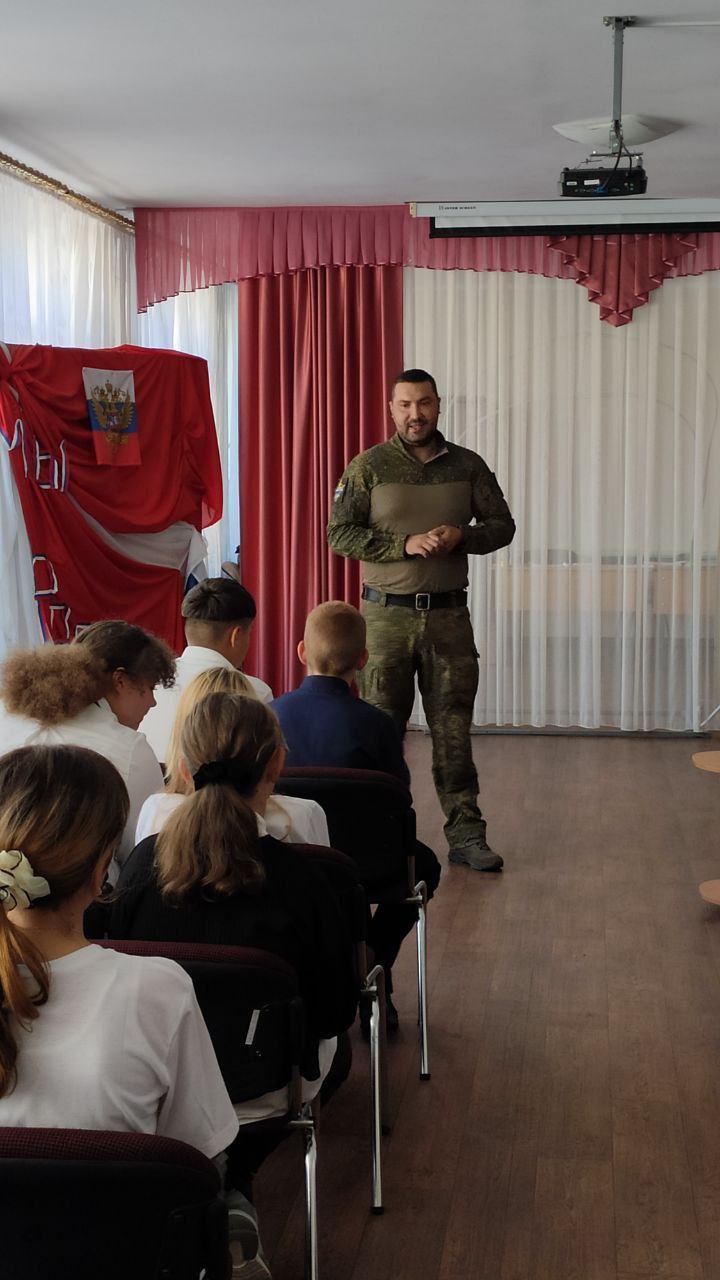 У Михайлівці того ж «округу» «урок мужності» проводив неназваний офіцер ЗС РФ, якого у школу привела «начальник територіального управління» Олена Павлова.