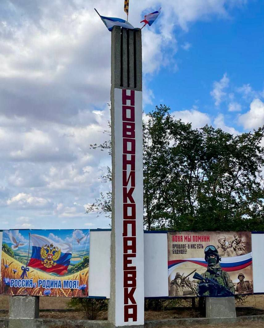 Те саме в окупованому Скадовському «муніципальному окрузі». На в’їзді у Новомиколаївку, наприклад, не лише переклали назву села на стелі, а повісили поряд свої пропагандистські білборди. Колись це все також буде лише гірким спомином.