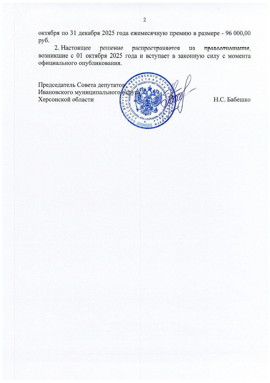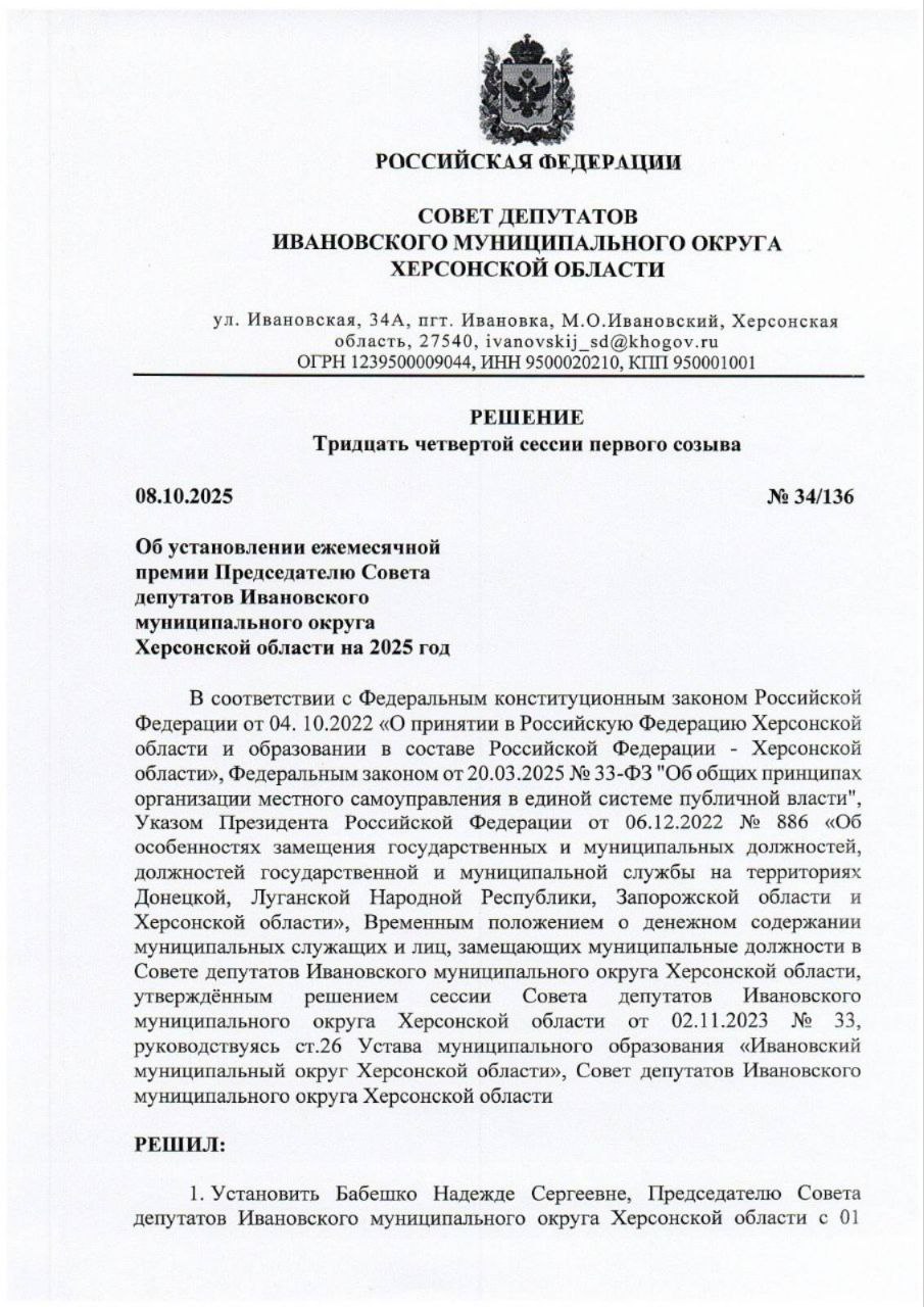 «Встановити Бабешко Надії Сергіївні, Голові Ради депутатів Іванівського муніципального округу Херсонської області з 01 жовтня по 31 грудня 2025 року щомісячну премію у розмірі – 96 000,00 руб.» – написано у рішенні. А підписала його… Надія Бабешко!