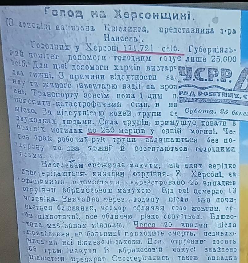 Голодомор 33-го – не єдиний, від якого потерпала Херсонщина. До цього був голодомор 21-23 років. Про цю трагедію мало хто згадує, але в ті дні щодня від голоду в Херсоні гинуло близько 250 людей. В селах розгорталися ще страшніша картина. Факти вбивств заради їжі були масовими. Іноземні свідки писали – “жахи Херсона перевищили все, що ми бачили в будь-яких районах України і Поволжжя”.