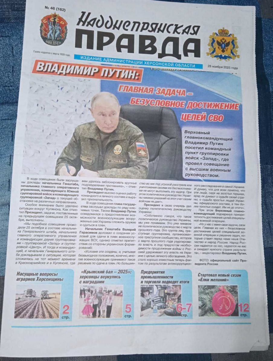 Взяти хоча б два останніх номери окупаційної агітки «Надднепрянская правда», яку можна зустріти у кожному «муніципальному окрузі». Прочитати там можна і про «безвихідне становище» ЗСУ на фронті, і про те, як «добрі» росіяни чекають наших воїнів у полон. «Але більшість з них під загрозою розстрілу або знищення своїми ж безпілотниками не можуть виконати це завдання», – цитують пропагандисти брехливу доповідь начальника російського генштабу Валєрія Гєрасімова президенту Владіміру Путіну.