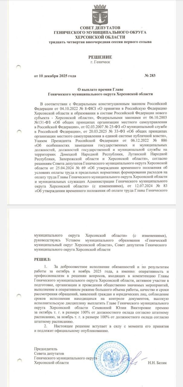 Є також питання, чому Семякіна повідомляє не про всі свої «заслуги». Як стало відомо редакції, на так званій 34-й позачерговій сесії окупаційної ради депутатів Генічеського «муніципального округу» зрадниці виписали премію за жовтень і листопад у розмірі 100 % від посадового окладу. У так званому рішенні № 283 йдеться: «За добросовісне виконання обов’язків і за результатами роботи за жовтень і листопад 2025 року, а саме: оперативність і професіоналізм у вирішенні питань, які належать до компетенції Голови Генічеського муніципального округу Херсонської області, активну участь у підготовці, організацій і проведенні суспільно значущих заходів, виконання в оперативному режимі великого обсягу роботи, якість і терміни розгляду звернень, заяв громадян і юридичних осіб, дотримання термінів виконання документів, що знаходяться на контролі, високу виконавчу дисципліну».
